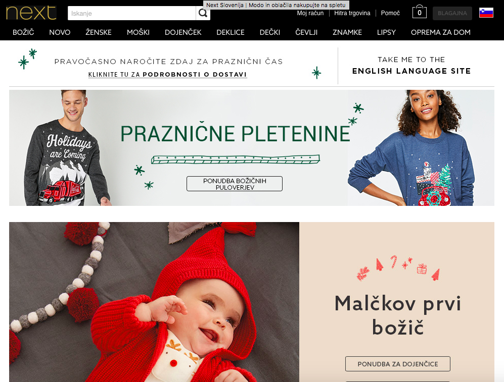 Next je angleška trgovina, ki ima več kot 700 trgovin po vsem svetu, njihove izdelke pa lahko kupimo tudi preko slovenske spletne strani. Na njej lahko najdemo cenovno ugodne kose tako za ženske, moške kot tudi za otroke. Poštnina stane 3 evre, če naročimo nad 30 evri pa je zastonj.