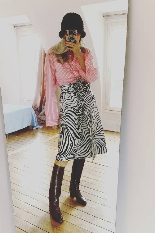 Novinarka Sophie Fontanel je kraljica fotografij v ogledalu in redno fotografira svoje kombinacije trendov in retro kosov.
