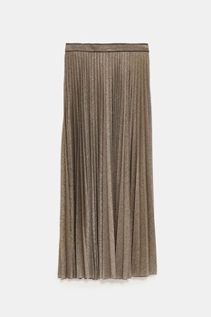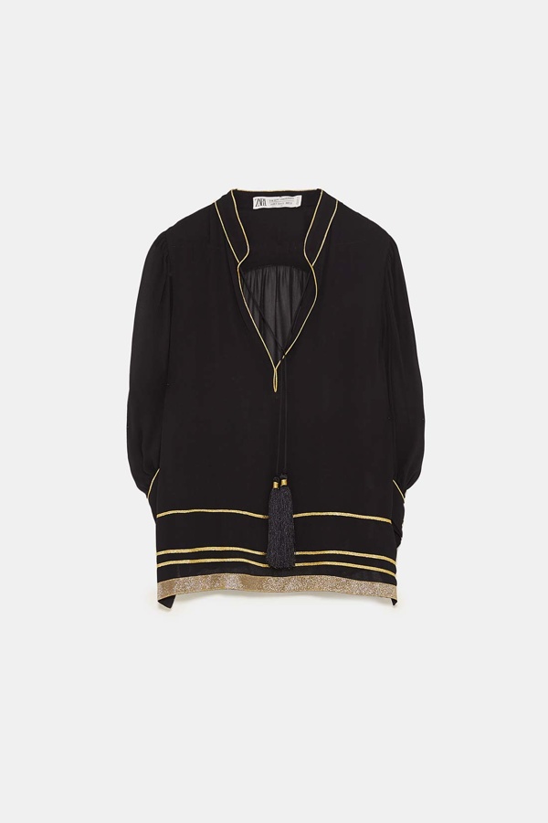 V kolekciji Zara Studio jesen/zima 2019 bomo našli predvsem obleke, krila in srajce v temnejših barvnih kombinacijah kot so črna, rjava in bordo z zlatimi detajli in sijočimi delci.