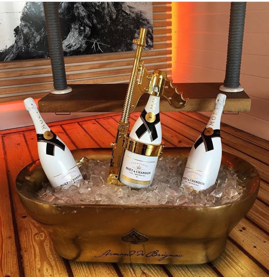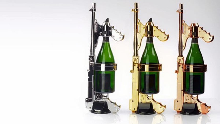 Pištola za šampanjec, s katero dobiva fraza "taking shots" tudi drug pomen. V svetu sicer popolnoma "nepotrebni" izum, ki ga v prvem delu sestavlja naprava, ki na prvi pogled spominja in deluje kot pištola in v drugem delu šampanjec, ki deluje kot gorivo, dosega v VIP svetu nove razsežnosti zabave.