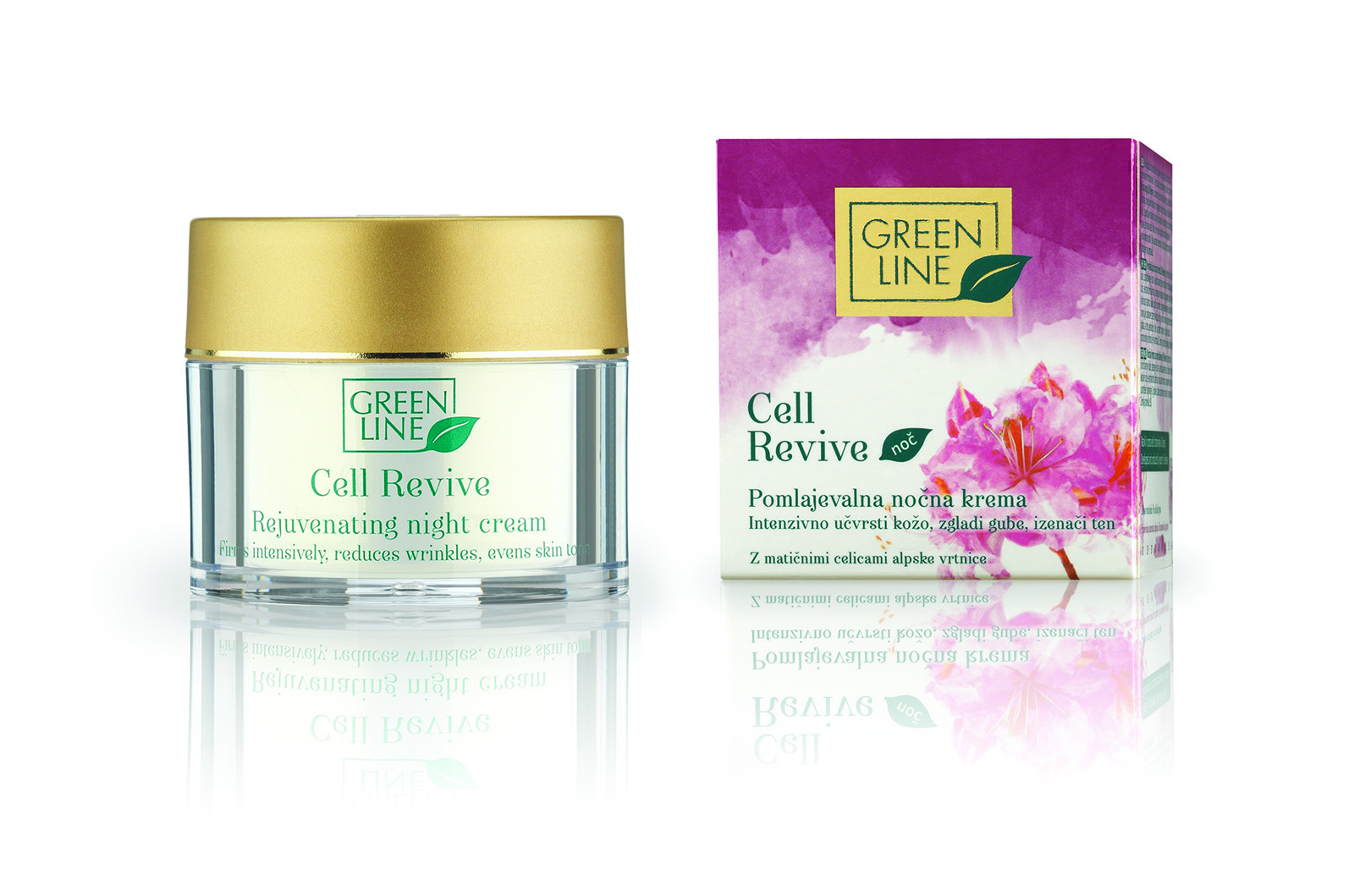 Green line Cell Revive Posebnost obrazne nege Cell Revive je v premišljeni kombinaciji učinkovin, ki spodbujajo naravne procese globinskega obnavljanja kože. Med izbranimi preverjenimi in nagrajenimi inovativnimi učinkovinami še posebej izstopajo dragocene matične celice alpske vrtnice in izvleček žafrana z dokazanim učinkovanjem. Obrazna nega Cell Revive nudi pomlajevalno dnevno in nočno kremo ter aktivacijski pomlajevalni serum za nego tanke in občutljive kože okoli oči in ustnic.