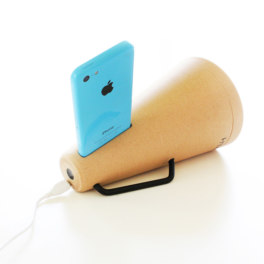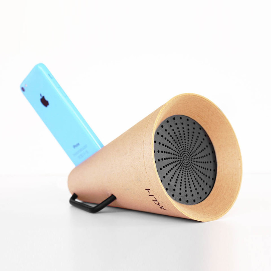 Slovenski oblikovalski trio AKLIH predstavlja Megafon, minimalističen in izredno estetski ojačevalec, ki za svoje delovanje ne potrebuje električne energije. Nastal je s tehnologijo kirurško natančnega 3-D tiskanja kombinacije lesa in biorazgradljive plastike, ostre zunanje linije pa zaključuje skrbno zasnovana geometrijska oblika notranjosti, ki optimizira zvoke in izboljša izkušnjo poslušanja glasbe. Za lažjo prenosljivost skrbi priročen ročaj, ki ob uporabi deluje tudi kot stojalo. Megafoni so voljo za različne modele iPhone in Samsung.