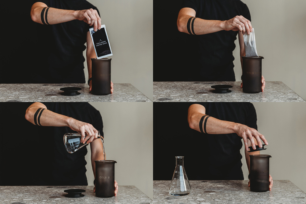 Cold Brew Kit poenostavi pripravo cold brew kave. Sveže zmleta kava je zapakirana v filter vrečke, ki jih v stilsko dovršenem kozarcu zgolj prelijemo s hladno vodo.