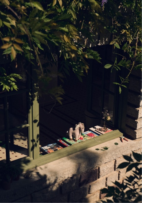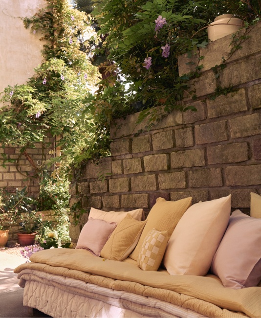 Zunaj sobice našo zanimanje vzbudi klop, odeta v nešteto odej različne debeline in odtenkov. Gre za dom, v katerem bi radi živeli in če ne gre drugače, pokupili vsaj vse, kar se v njem da kupiti. Nič lažjega, tukaj so sončni dnevi.
