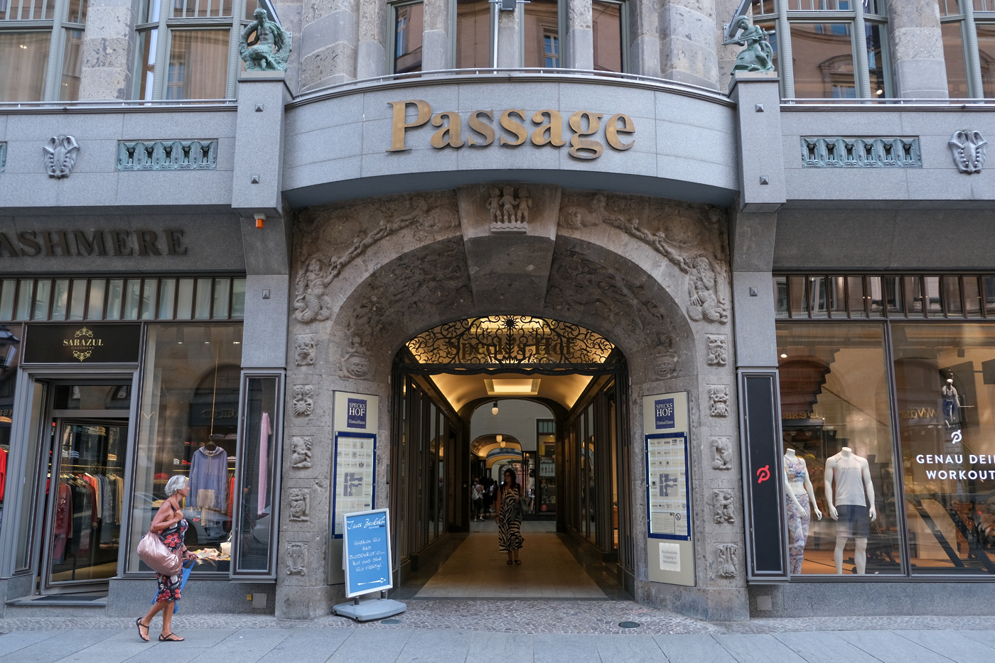 Posebej zanimiva je notranja mreža pokritih hodnikov, ki povezujejo mestne hiše. V več kot 30 pokritih prehodih z arkadami je mogoče najti številne trgovinice in kavarne. Najbolj impozantna med njimi je gotovo Mädlerjeva pasaža, ki velja za najbolj prepoznavno nakupovalno promenado v mestu. Tam boste našli tudi Auerbachovo klet, kamor je rad zahajal znameniti literat Johann Wolfgang von Goethe. V restavraciji, ki danes velja za eno najbolj obiskanih v mestu, je dobil navdih za prizor v znameniti tragediji Faust, kjer se Faust sreča z Mefistom.