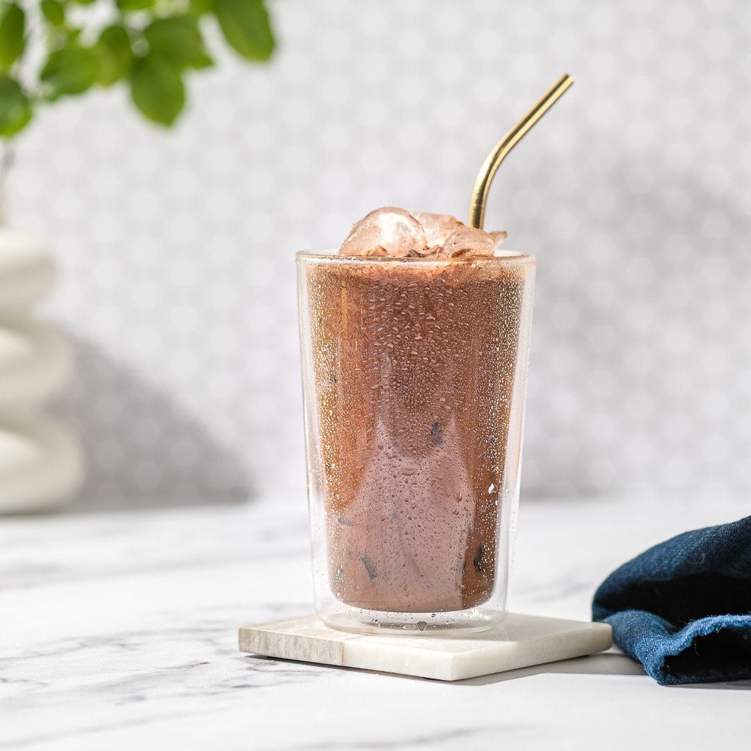 Priprava: Pripravite cold brew kavo in jo zlijte v blender. V blender dodajte banano, led, mandljevo maslo, čokoladne beljakovine in lanena semena. Vse skupaj zmiksajte in prelijte v kozarec.