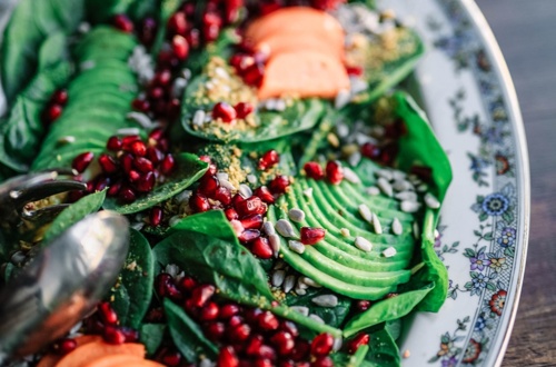 Solata z granatnim jabolkom, avokadom in kandiranimi orehi