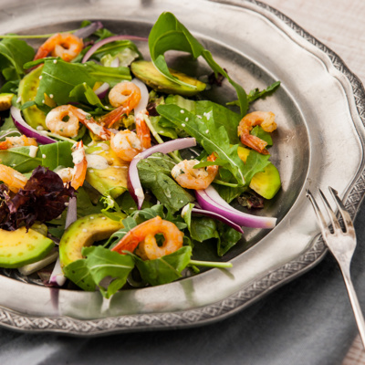 Recept - Solata s kozicami, pomarančo in granatnim jabolkom