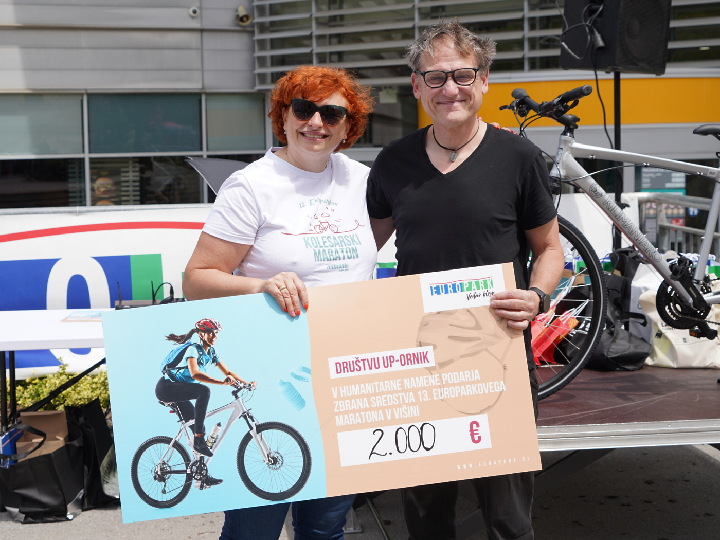 Udeleženci kolesarskega maratona so tudi to leto poganjali pedala za tiste, ki najbolj potrebujejo pomoč. Sredstva, zbrana s prijavninami na kolesarski maraton, so v Europarku namenili društvu UP-ornik, ki pomaga ranljivim skupinam prebivalstva. Donacijo v višini 2.000 evrov je prevzel ustanovitelj in glavni upornik Boris Krabonja:
