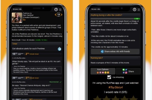Zabavna, a če dobro pomislimo, prav zares praktična, aplikacije je RunPee, ki nam pove, kdaj med ogledom filma, se splača smukniti na stranišče. Prav gotovo se je že vsakemu izmed nas zgodilo, da nismo želeli zamuditi dela filma v kinu ali doma. Če nimamo možnosti zaustaviti predvajanja, je ta aplikacija zagotovo za nas! Pa še to - ko se vrnemo iz kopalnice, nam aplikacija pripravi povzetek vsega, kar smo zamudili. Super, kajne?