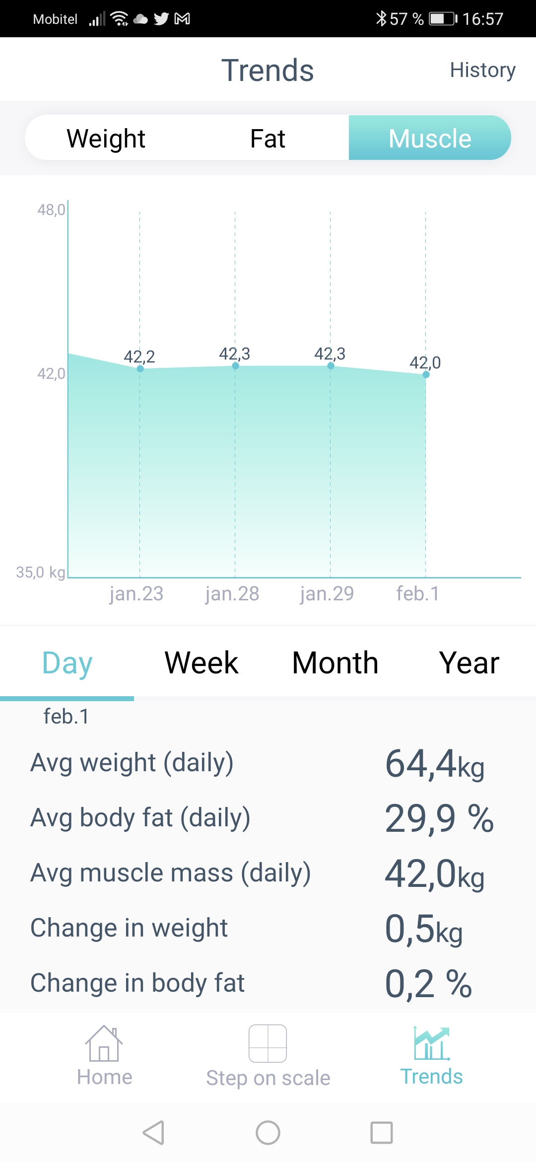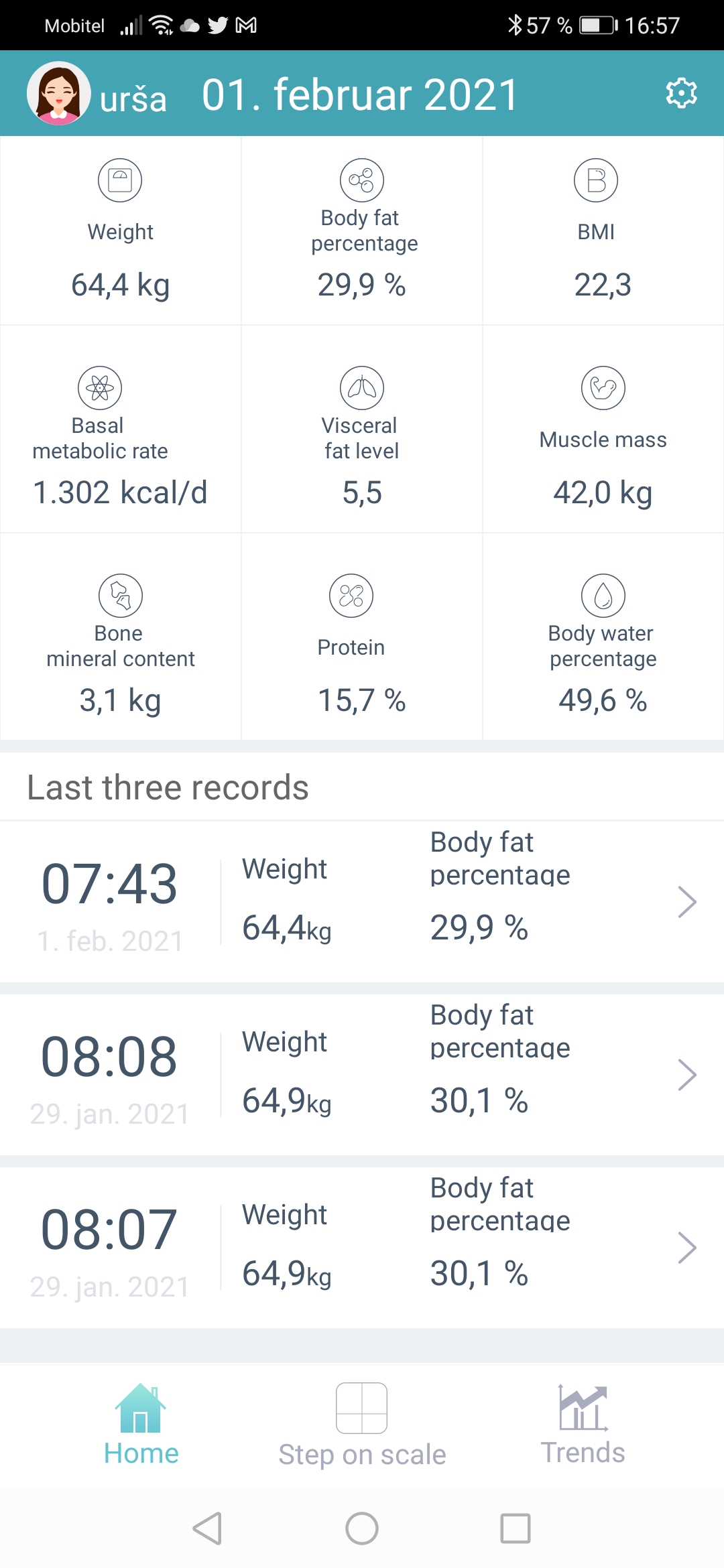 Po pregledu podatkov, ki mi jih je izpisalo v aplikaciji, zdaj vsekakor drugače gledam na svoje telo, ki ga ob občasnih trenutkih slabosti resda izkoristim za najbolj pregrešne prehrambne užitke. Huawei Body Fat Scale namreč vse moje prehranske napake naniza v kar devet različnih postavk, od teže in odstotka telesne maščobe do kostne mase, mišične mase, odstotka vode in celo točnega odmerka notranje (t.i. visceralne) maščobe, to je tiste, ki se nabira okoli trebuha in resno kvari dobro voljo med obiskom plaže.